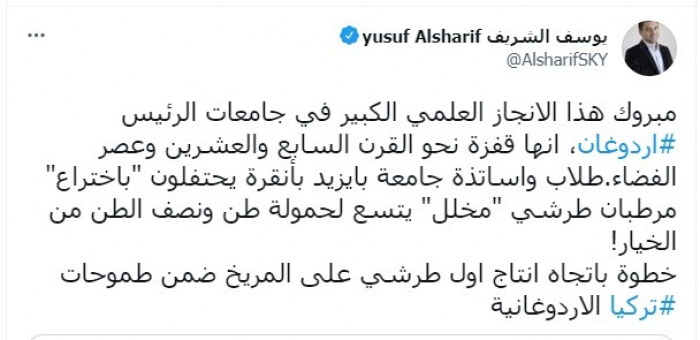 وعلق في تغريدة عبر "تويتر"، اليوم، قائلا: "مبروك هذا الإنجاز العلمي الكبير في جامعات الرئيس أردوغان، إنها قفزة نحو القرن السابع والعشرين وعصر الفضاء".