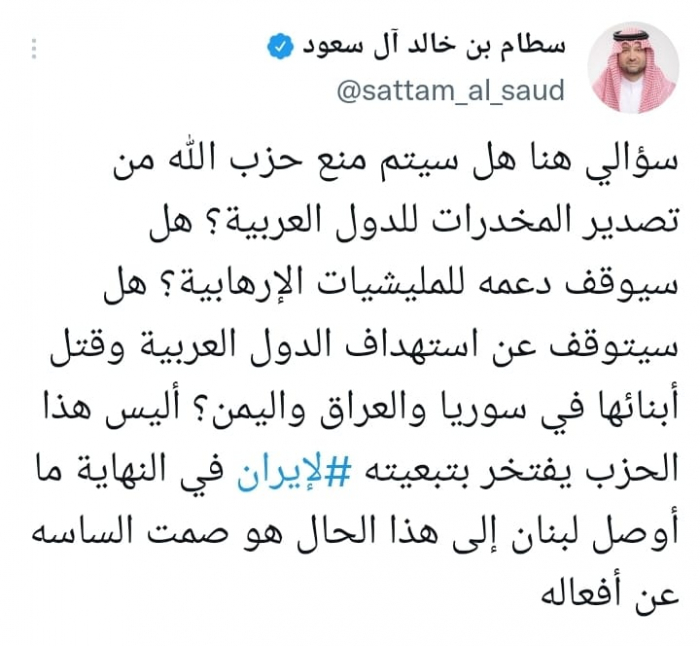استنكر الأمير السعودي سطام بن خالد آل سعود، صمت السياسيين اللبنانيين عن جرائم مليشيات حزب الله الموالية لإيران، مشددا على أنها تواصل استهداف الدول العربية.