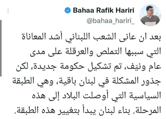 اعتبر رجل الأعمال اللبناني بهاء الحريري، نجل رئيس وزراء لبنان الراحل رفيق الحريري، أن مشكلة لبنان في نخبتها السياسية وليست تشكيل الحكومة.
