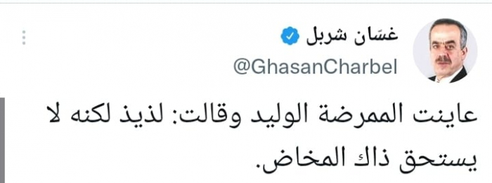 وقال في تغريدة على حسابه بموقع التدوين المصغر تويتر، اليوم: " عاينت الممرضة الوليد وقالت: لذيذ لكنه لا يستحق ذاك المخاض"، في إشارة لوزراء الحكومة وانتماءاتهم.