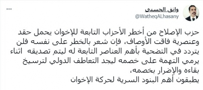 وشدد في تغريدة على حسابه بتويتر، اليوم السبت، على أن: "حزب الإصلاح من أخطر الأحزاب التابعة للإخوان يحمل حقد وعنصرية فاقت الأوصاف".