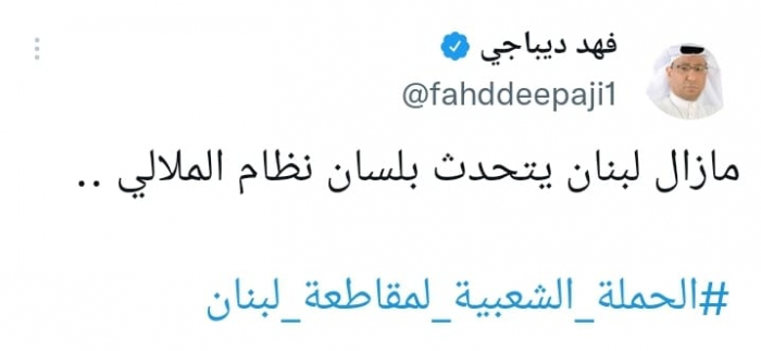 وأكد في تغريدة على حسابه بموقع التدوين المصغر تويتر، اليوم أنه: "مازال لبنان يتحدث بلسان نظام الملالي"، مضيفا هاشتاج: "الحملة الشعبية لمقاطعة لبنان".