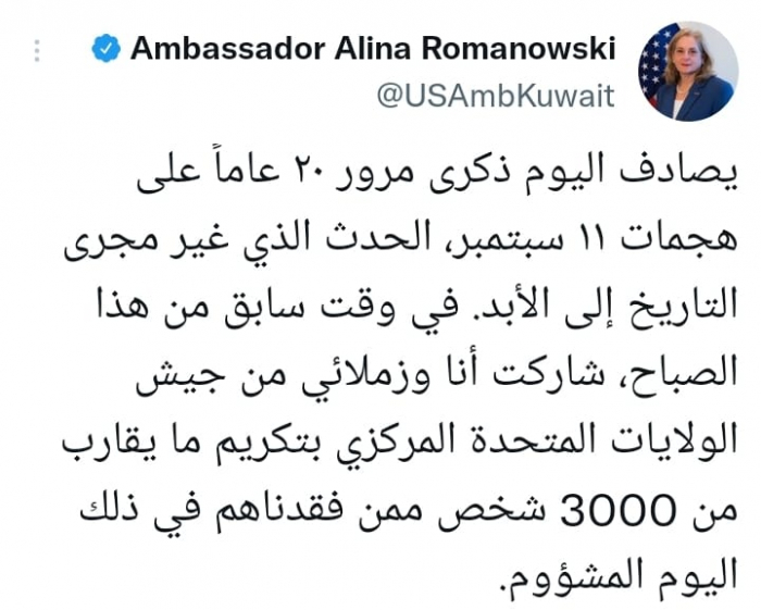 اعتبرت إلينا رومانوسكي، سفيرة الولايات المتحدة الأمريكية لدى دولة الكويت، أن هجمات الحادي عشر من سبتمبر غيرت التاريخ، معلنة مشاركتها في مراسم إحياء ذكرى ضحايا الجريمة الإرهابية.