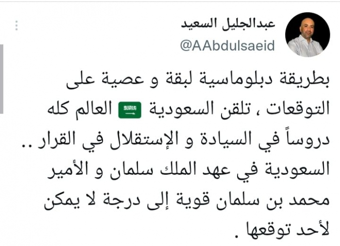 وكشف في تغريدة على حسابه بموقع التدوين المصغر تويتر، اليوم أنه: "بطريقة دبلوماسية لبقة وعصية على التوقعات، تلقن السعودية العالم كله دروسا في السيادة والاستقلال في القرار".