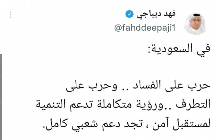 واعتبر في تغريدة على حسابه بموقع التدوين المصغر تويتر، اليوم أن: "في السعودية: حرب على الفساد.. وحرب على التطرف".
