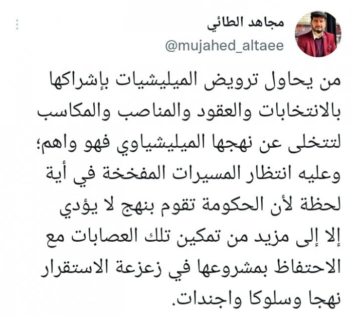 وأردف: "لأن الحكومة تقوم بنهج لا يؤدي إلا إلى مزيد من تمكين تلك العصابات مع الاحتفاظ بمشروعها في زعزعة الاستقرار نهجا وسلوكا وأجندات".