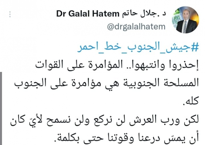 وشدد في تغريدة على حسابه بموقع التدوين المصغر تويتر، اليوم على أن: "جيش الجنوب خط أحمر".