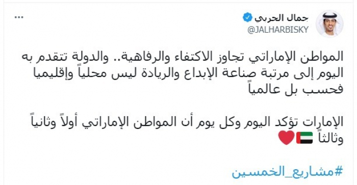 أشاد الإعلامي جمال الحربي، بجهود دولة الإمارات في الارتقاء بمواطنيها والاهتمام بالعنصر البشري، بالتزامن مع إطلاق الحزمة الثانية من مشاريع الخمسين التي ترسم مسار الدولة خلال الـ 50 عاما المقبلة.