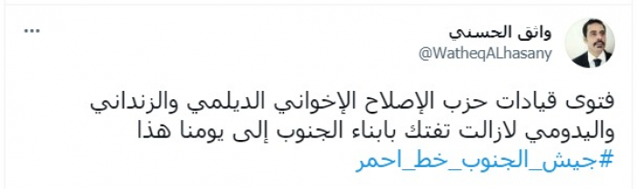 واختتم تغريدته بهاشتاج: "جيش الجنوب خط أحمر".
