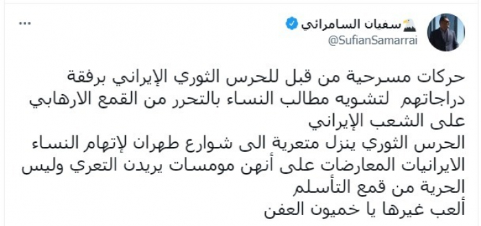 انتقد الإعلامي العراقي سفيان السامرائي، محاولات الحرس الثوري الإيراني، تشويه النساء المعارضات اللائي يطالبن بالتحرر من القمع، واصفا تلك الأساليب بالحركات المسرحية.