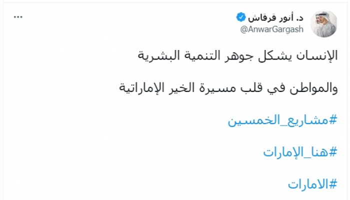 أشاد الدكتور أنور قرقاش، المستشار الدبلوماسي لرئيس دولة الإمارات، باهتمام القيادة الرشيدة بالمواطنين في مسيرة التنمية، تزامنا مع إعلان الحزمة الثانية من مشاريع الخمسين التي تهتم بالعنصر البشري.