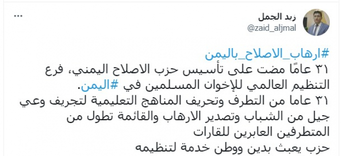 هاجم زيد الجمل، السكرتير الصحفي لرئيس المجلس الانتقالي الجنوبي، حزب الإصلاح، في ذكرى مرور 31 عاما على تأسيس فرع جماعة الإخوان الإرهابية في اليمن.