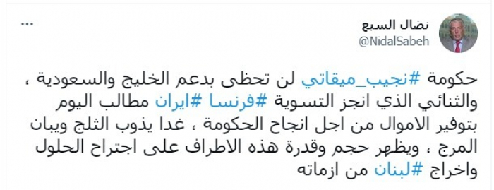 وقال في تغريدة عبر "تويتر"، اليوم: "حكومة نجيب ميقاتي لن تحظى بدعم الخليج والسعودية".