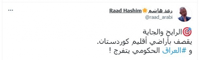 وأشار في تغريدة عبر "تويتر"، اليوم": "الرايح والجاية.. يقصف بأراضي إقليم كوردستان"، في إشارة إلى قصف مليشيات إيران لمطار أربيل، أمس.