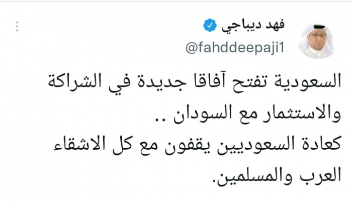 وقال في تغريدة على حسابه بموقع التدوين المصغر تويتر، اليوم إن: "السعودية تفتح آفاقا جديدة في الشراكة والاستثمار مع السودان، كعادة السعوديين يقفون مع كل الأشقاء العرب والمسلمين".