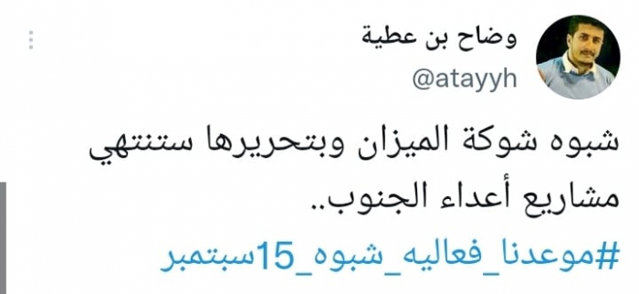وقال في تغريدة على حسابه بموقع التدوين المصغر تويتر، اليوم إن: "شبوة شوكة الميزان وبتحريرها ستنتهي مشاريع أعداء الجنوب"، مختتما بهاشتاج: "موعدنا فعالية شبوة 15 سبتمبر".