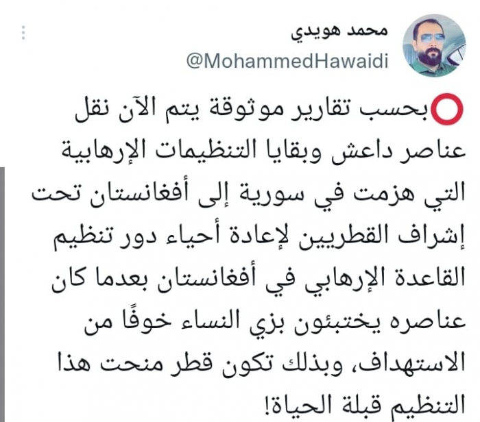 وكشف في تغريدة على حسابه بموقع التدوين المصغر تويتر، اليوم أنه: "بحسب تقارير موثوقة يتم الآن نقل عناصر داعش وبقايا التنظيمات الإرهابية التي هزمت في سورية إلى أفغانستان تحت إشراف القطريين لإعادة إحياء دور تنظيم القاعدة الإرهابي في أفغانستان".