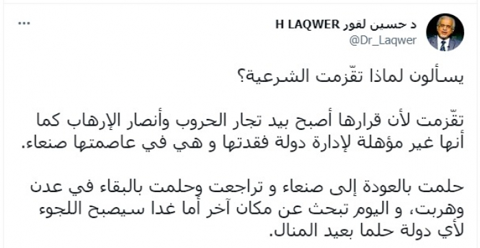 وقال في تغريدة عبر "تويتر"، اليوم: "يسألون لماذا تقّزمت الشرعية؟".