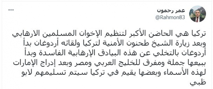 وأوضح في تغريدة عبر "تويتر"، اليوم: "تركيا هي الحاضن الأكبر لتنظيم الإخوان المسلمين الإرهابي، بعد زيارة الشيخ طحنون الأمنية لتركيا ولقائه أردوغان، بدأ بالتخلي عن هذه البيادق الإرهابية الفاسدة".