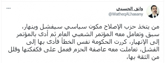 وشدد في تغريدة عبر "تويتر"، اليوم، على أن: "من يتخذ حزب الإصلاح مكونا سياسيا سيفشل وينهار".