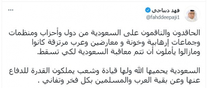 وجه المحلل السياسي فهد ديباجي، اليوم الثلاثاء، رسالة للحاقدين على السعودية الذين يرغبون في إسقاط المملكة.