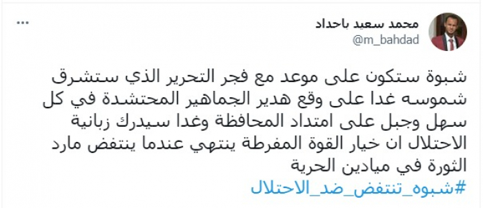 شدد الناشط السياسي محمد سعيد باحداد، على أن شبوة على موعد مع التحرير من الإرهاب غدا، بالتزامن مع دعوات شباب المحافظة للانتفاضة ضد الاحتلال.