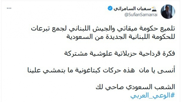 وقال في تغريدة عبر "تويتر"، اليوم،: "تلميع حكومة ميقاتي والجيش اللبناني لجمع تبرعات للحكومة اللبنانية الجديدة من السعودية".