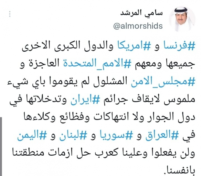ورأى في تغريدة على حسابه بموقع التدوين المصغر تويتر، اليوم أن: "فرنسا وأمريكا والدول الكبرى الأخرى جميعها ومعهم الأمم المتحدة العاجزة ومجلس الأمن المشلول لم يقوموا بأي شيء ملموس لإيقاف جرائم إيران".