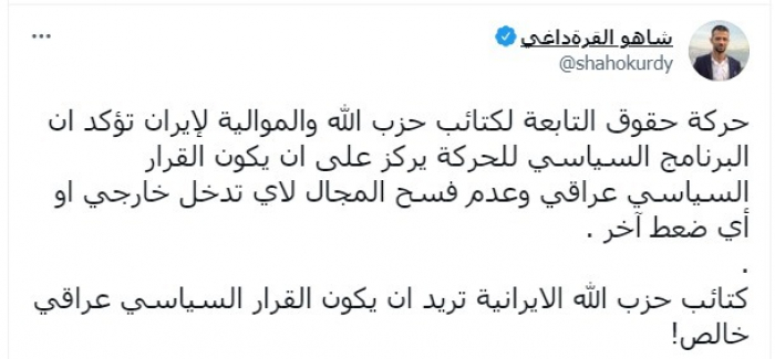 أبدى الكاتب الصحفي العراقي شاهو القرة داغي، تعجبه من تصريحات حزب الله العراقي الموالي لإيران الممثل في ما يسمى بحركة حقوق، بشأن برنامجها السياسي للانتخابات التشريعية العراقية.
