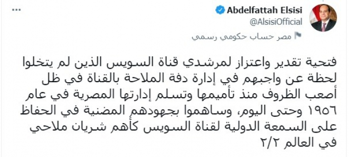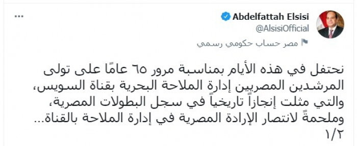وقال في تغريدتين عبر "تويتر": "نحتفل في هذه الأيام بمناسبة مرور 65 عاما على تولى المرشدين المصريين إدارة الملاحة البحرية بقناة السويس".