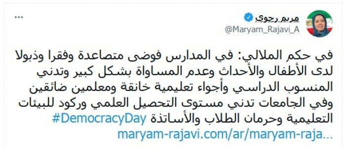 وأشارت في تغريدة عبر "تويتر"، اليوم، إلى حكم الملالي، قائلة: "في المدارس فوضى متصاعدة وفقر وذبول لدى الأطفال والأحداث وعدم المساواة بشكل كبير وتدني المنسوب الدراسي".
