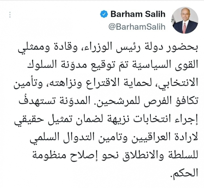 أعلن رئيس دولة العراق برهم صالح توقيع القوى السياسية مدونة للسلوك الانتخابي، بهدف ضمان نزاهتها وقاعدة تكافؤ الفرص.