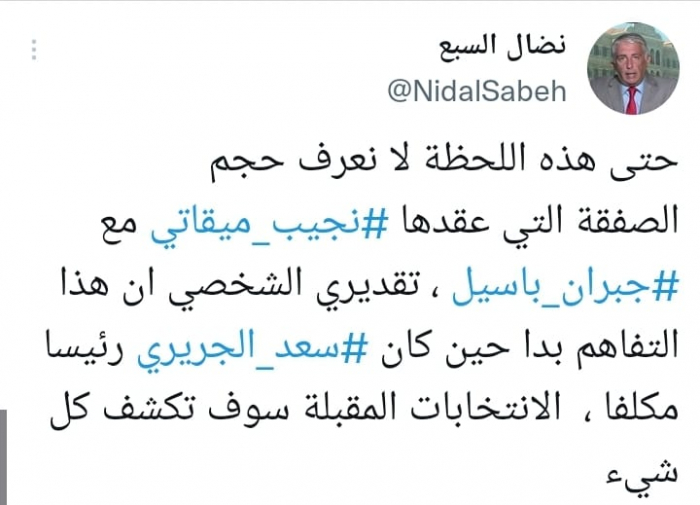 وأشار في تغريدة على حسابه بموقع التدوين المصغر تويتر، اليوم إلى أنه: "حتى هذه اللحظة لا نعرف حجم الصفقة التي عقدها نجيب ميقاتي مع جبران باسيل".