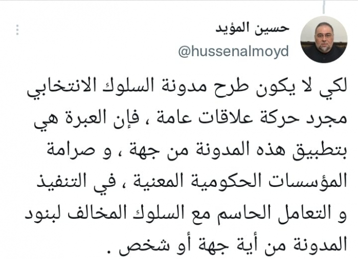 وقال في تغريدة على حسابه بموقع التدوين المصغر تويتر، اليوم إنه: "لكي لا يكون طرح مدونة السلوك الانتخابي مجرد حركة علاقات عامة، فإن العبرة هي بتطبيق هذه المدونة من جهة، و صرامة المؤسسات الحكومية المعنية ، في التنفيذ و التعامل الحاسم مع السلوك المخالف لبنود المدونة من أية جهة أو شخص".