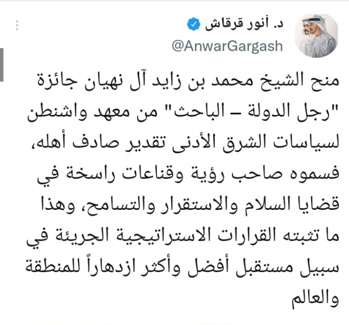 وأكد في تغريدة على حسابه بموقع التدوين المصغر تويتر، اليوم أن: "منح الشيخ محمد بن زايد آل نهيان جائزة (رجل الدولة – الباحث) من معهد واشنطن لسياسات الشرق الأدنى تقدير صادف أهله".