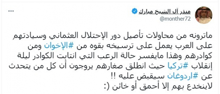 شدد المدون السعودي منذر آل الشيخ مبارك، على أن جماعة الإخوان الإرهابية، تقف وراء المحاولات المستمرة لتأصيل الاحتلال العثماني للعرب.