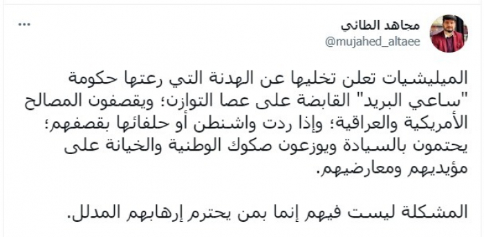 انتقد الكاتب والباحث السياسي العراقي مجاهد الطائي، تخلي مليشيات إيران عن الهدنة الأمريكية، واستمرارها في قصف المصالح الأمريكية والعراقية.