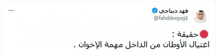 وأوضح في تغريدة عبر "تويتر"، اليوم: "حقيقة.. اغتيال الأوطان من الداخل مهمة الإخوان".