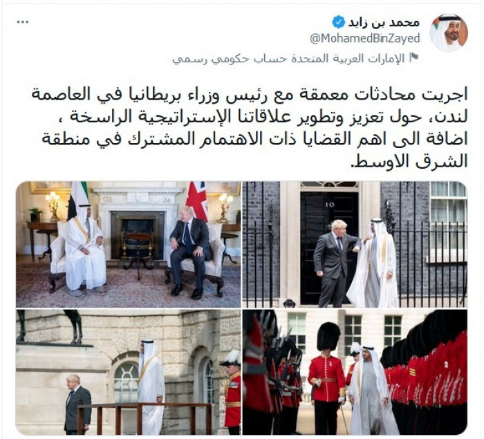 كشف صاحب السمو الشيخ محمد بن زايد، ولي عهد أبوظبي، نائب القائد الأعلى للقوات المسلحة بدولة الإمارات، تفاصيل زيارته إلى لندن ولقاء رئيس الوزراء البريطاني بوريس جونسون.