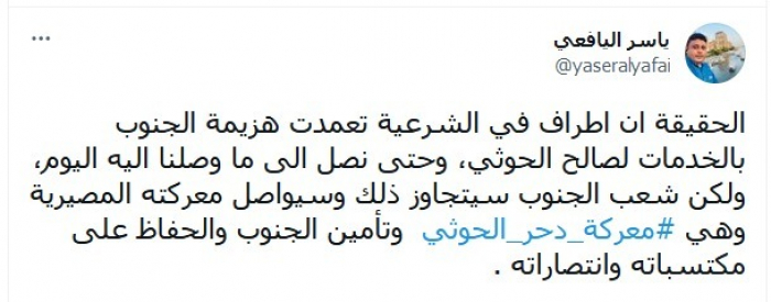 وشدد على أن: "شعب الجنوب سيتجاوز ذلك وسيواصل معركته المصيرية وهي معركة دحر الحوثي وتأمين الجنوب والحفاظ على مكتسباته وانتصاراته".