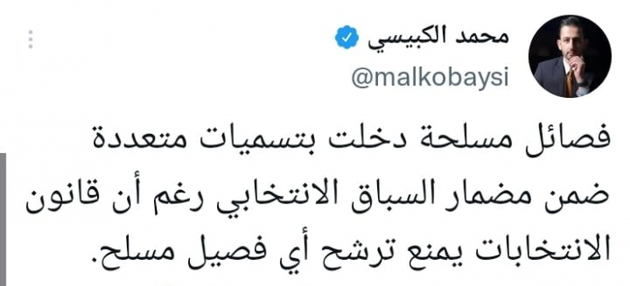وأوضح في تغريدة على حسابه بموقع التدوين المصغر تويتر، اليوم أن: "فصائل مسلحة دخلت بتسميات متعددة ضمن مضمار السباق الانتخابي رغم أن قانون الانتخابات يمنع ترشح أي فصيل مسلح".