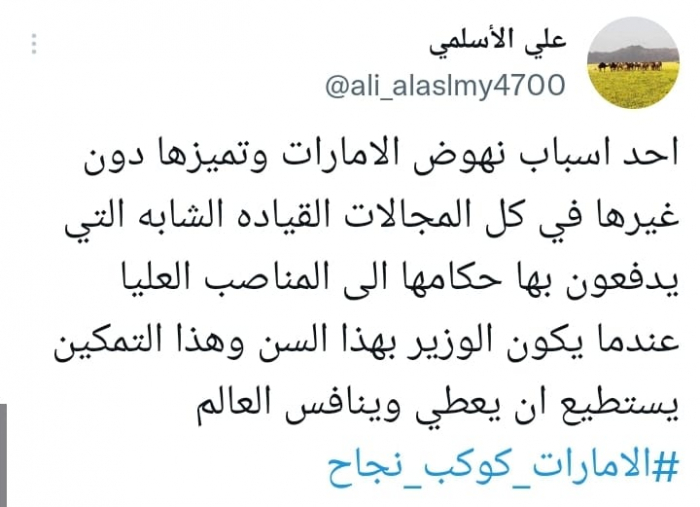 اعتبر الناشط السياسي علي الأسلمي، أن اعتماد الإمارات على ثروتها الشبابية سر نهضتها في مختلف المجالات.