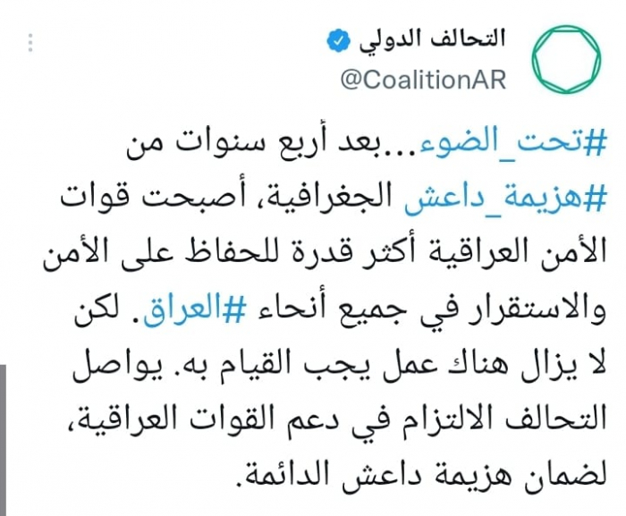 وتابع: "لكن لا يزال هناك عمل يجب القيام به"، موضحا أنه: "يواصل التحالف الالتزام في دعم القوات العراقية، لضمان هزيمة داعش الدائمة".