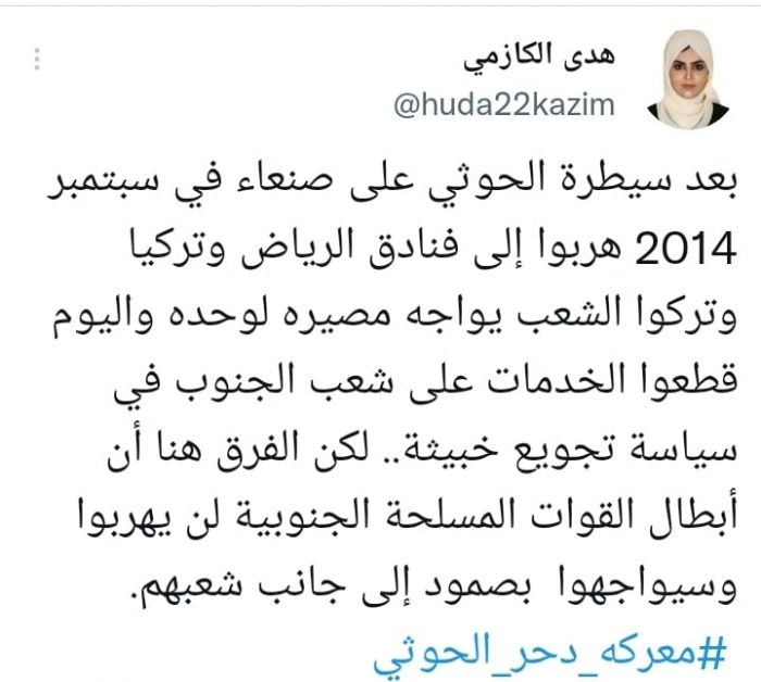 وأضافت: "اليوم قطعوا الخدمات على شعب الجنوب في سياسة تجويع خبيثة، لكن الفرق هنا أن أبطال القوات المسلحة الجنوبية لن يهربوا وسيواجهوا بصمود إلى جانب شعبهم"، مختتمة بهاشتاج: "معركة دحر الحوثي".