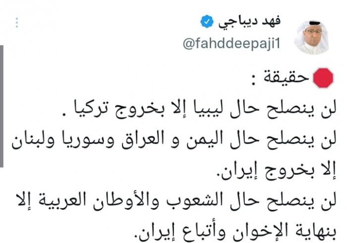 واعتبر في تغريدة على حسابه بموقع التدوين المصغر تويتر، اليوم أنه: "لن ينصلح حال ليبيا إلا بخروج تركيا، ولن ينصلح حال اليمن والعراق وسوريا ولبنان إلا بخروج إيران".