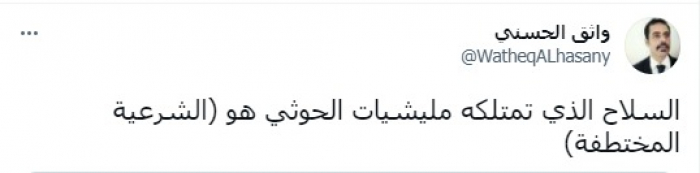 وشدد في تغريدة على حسابه بتويتر، اليوم السبت، على أن: "السلاح الذي تمتلكه مليشيات الحوثي هو (الشرعية المختطفة)".
