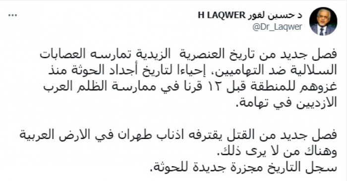 وأكد في تغريدة على حسابه بتويتر، اليوم السبت أنه: "فصل جديد من تاريخ العنصرية الزيدية تمارسه العصابات السلالية ضد التهاميين، إحياء لتاريخ أجداد الحوثة منذ غزوهم للمنطقة قبل 12 قرنا في ممارسة الظلم العرب الأزديين في تهامة".