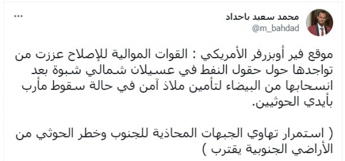 حذر الناشط السياسي محمد سعيد باحداد، من خطر مليشيا الحوثي الإرهابية تجاه الجنوب، بعد تسليم مليشيات الشرعية الإخوانية مناطق لها بالبيضاء، وانسحابهم نحو حقول النفط بعسيلان.
