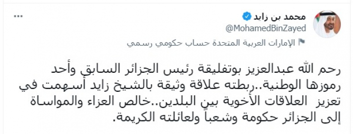 وكتب في تغريدة عبر "تويتر"، اليوم: "رحم الله عبدالعزيز بوتفليقة رئيس الجزائر السابق، وأحد رموزها الوطنية.. ربطته علاقة وثيقة بالشيخ زايد أسهمت في تعزيز العلاقات الأخوية بين البلدين".