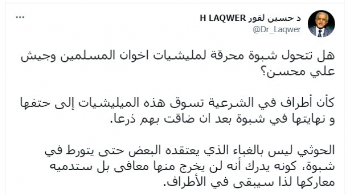 وتساءل في تغريدة عبر "تويتر"، اليوم: "هل تتحول شبوة محرقة لمليشيات الإخوان وجيش جنرال الإرهاب علي محسن؟".